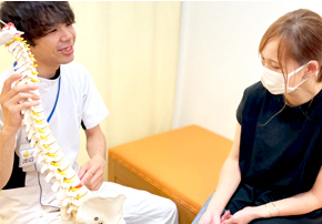 まず詳しいカウンセリングで 患者さまが訴えられている 症状を確認し検査します。 その後、痛みの原因となる ネジレやユガミがある骨格や 骨盤に対して矯正を施していくことが 当院で行われる整体施術です。 またご自身に自宅で可能な矯正や、 気をつける姿勢、 食事、睡眠などの 指導を行っていきます。