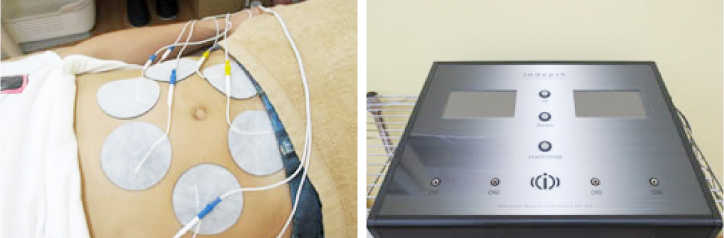EMSとは Electrical Muscle Stimulationの略称で、 筋肉に直接電気刺激を与えて 収縮(運動)させる装置です。 当院で扱うindepthは、 16,000Hzの高周波が出力でき、 体幹部(インナーマッスル)まで届くため 表面の筋肉だけでなく、通常はトレーニングを しづらいインナーマッスルの トレーニングにも最適です。